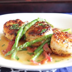 Nothing goes better with Scallops than crispy bacon bits! The asparagus is to keep it fresh. If you are able to get Fresh jumbo scallops, what a difference it makes compared to scallops that has been frozen in the grocery for months!